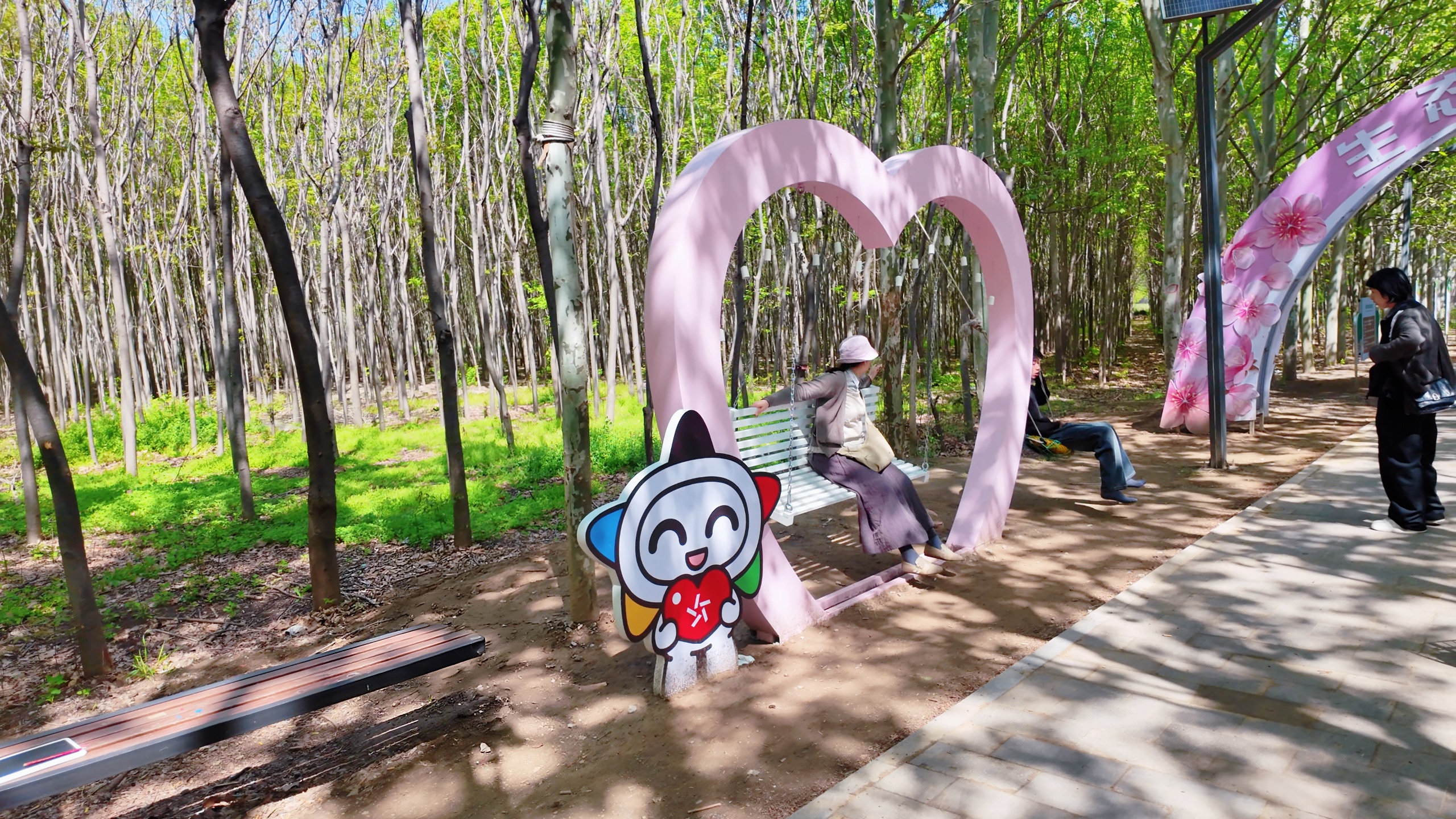 总共景致不断变换,嫩绿柳丝轻拂水岸,粉白桃花漫天匝地。行至疏影路,树木葱郁、树影婆娑,“一齐生花”彩色大地与当然花海酷爱无限,踱步其间步步齐景,顺手就能拍出刷爆一又友圈的文艺大片。