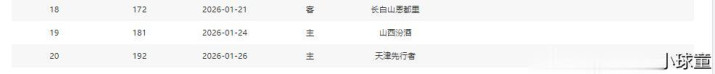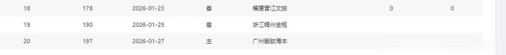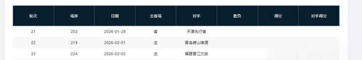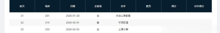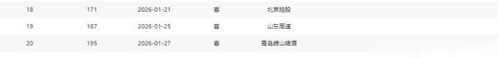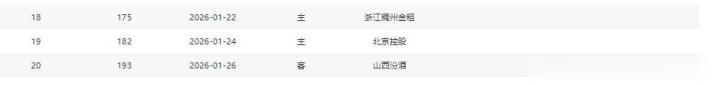 分别是客战吉林(暂居第13)、主场战山西(暂居第8)、主场战天津(暂居第16)、主场战吉林(暂居第13)、客场战宁波(暂居第11)、主场战上海(暂居第2)