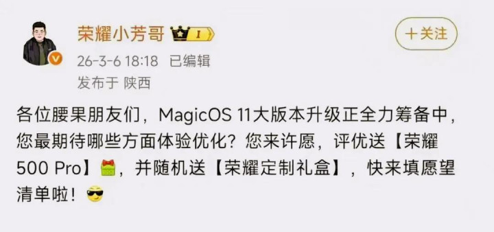 酬酢媒体动态截图 :荣耀小芳哥发布的MagicOS 11升级许诺手脚内容