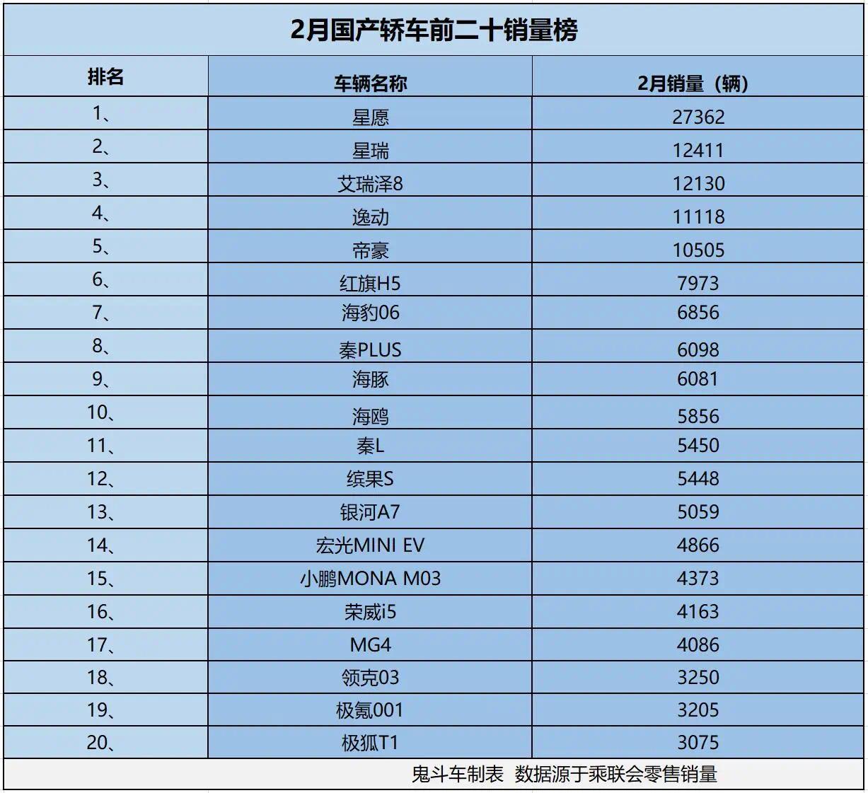 之是以这样说,是因为有销量数据为证。日前,乘联会发布2月车市零卖销量数据,鬼哥整理出2月国产轿车零卖销量排行前二十榜单,成果发现,榜单上,仅有5款车型销量过万。接下来,望望具体车型排行与销量发扬?